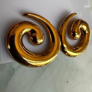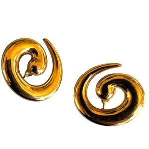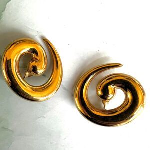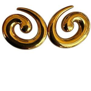 Striking vintage Monet statement earrings featuring a bold sculptural swirl design in rich gold-tone metal. High-shine finish with Monet’s signature triple-line detail on the clips. These 1980s beauties have that glamorous, modernist vibe Monet was known for — elegant, confident, and timeless.