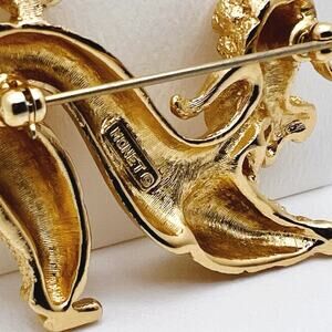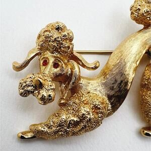 Monet Vintage Brushed Matte Gold Tone and Red Rhinestone Accents Play Pose Poodle Puppy Dog Statement Brooch (EUC)
