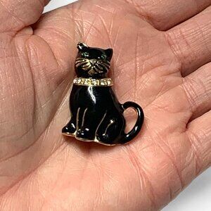 A beautifully detailed enamel and crystal brooch featuring a black cat design, adorned with rhinestones and green eyes, perfect for cat lovers and lovers of whimsical style. The reverse of the brooch is signed Monet and features shiny gold tone metal with a working pin clasp. Retro kitsch vibes. A must have for black kitty aficionados!
