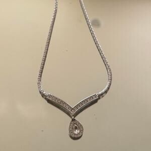Elegant vintage necklace featuring a V-shaped chain design adorned with sparkling crystals and a teardrop crystal pendant. The intricate craftsmanship and subtle shimmer make it a timeless piece — perfect for weddings, evening wear, or elevating a classic outfit.
