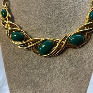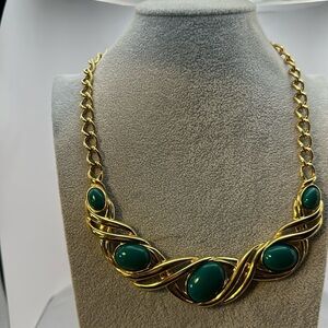 Monet, beautiful, gold tone and green necklace. Chain is 14 inches drop is 9 inc