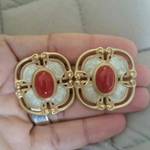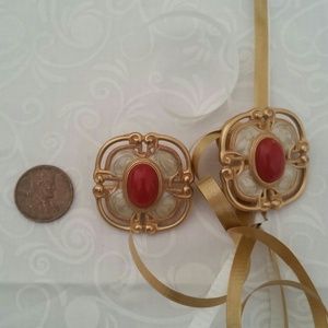 Monet designer matte gold enamel red earrings