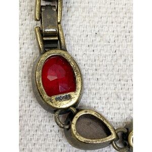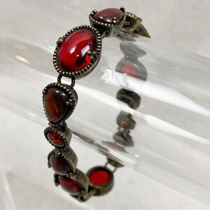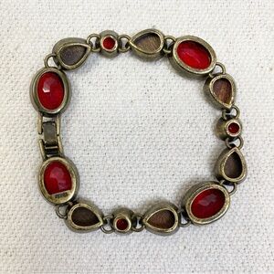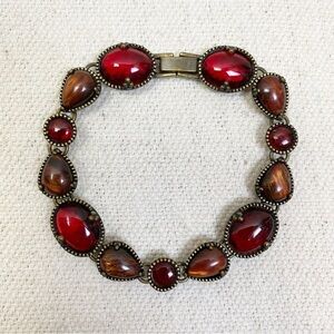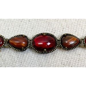 Antiqued gold tone bracelet with bezel set acrylic cabochons in simulated tigers eye and deep red - fold over clasp - gently worn, no flaws
