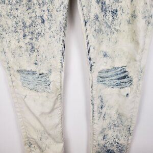 Classic 5-pocket jeans with front zipper fly and button closure. Skinny leg. Factory distressed throughout with a classic acid wash look.