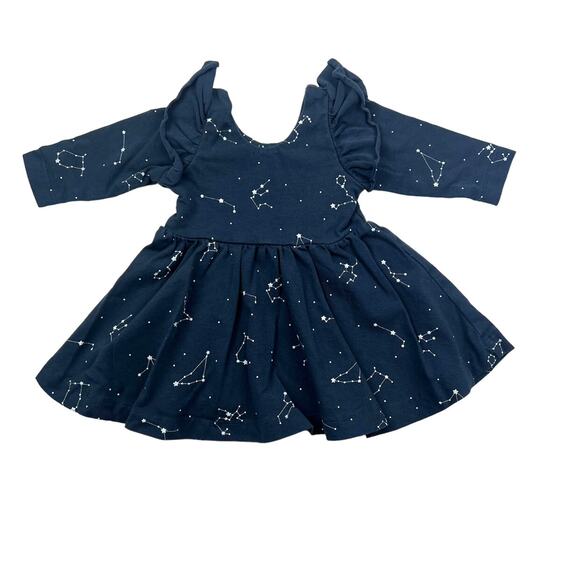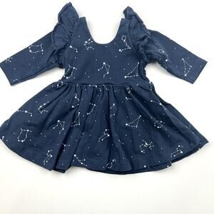 Monica + Andy Navy Constellations Dress with ruffles. Organic cotton blend. Size 0/6m, VGUC.