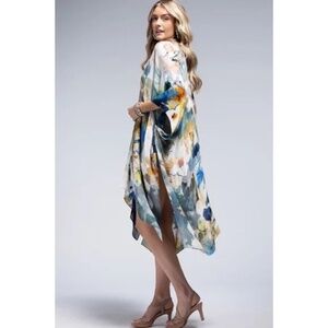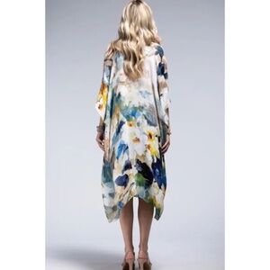 Lightweight kimono featuring a floral print that captures the essence of watercolor painting. The colors blend together seamlessly, creating an artistic and visually captivating effect. It is a truly beautiful and eye-catching piece of clothing.