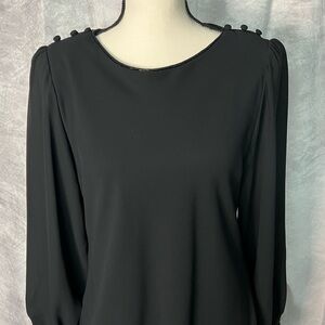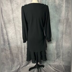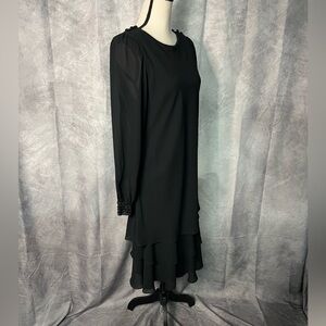 This elegant black layered dress features a sophisticated design perfect for any occasion. The long sleeves and flowing layers add a touch of class. Ideal for evening events or a stylish day out. Monica Richards of California USA brand long sleeved dress with ruffle layered skirt. Beading at the neckline and on the cuffs. Three buttons on each shoulder. Oh, and SHOULDER PADS!! The only flaw I noticed was a small spot of discoloration on the front right of the chest, but it’s only noticeable when you’re very close to it. Size 12. Measurements taken when dress is lying flat and are approximate.