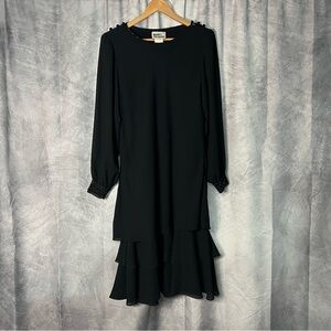 This elegant black layered dress features a sophisticated design perfect for any occasion. The long sleeves and flowing layers add a touch of class. Ideal for evening events or a stylish day out. Monica Richards of California USA brand long sleeved dress with ruffle layered skirt. Beading at the neckline and on the cuffs. Three buttons on each shoulder. Oh, and SHOULDER PADS!! The only flaw I noticed was a small spot of discoloration on the front right of the chest, but it’s only noticeable when you’re very close to it. Size 12. Measurements taken when dress is lying flat and are approximate.