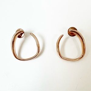 Subtle, simple elegance accurately describes these stunning earrings by London jewelry designer Monica Vinader. Made from 18ct rose gold vermeil these earrings give the look of a hoop with a post insert. Liquid curves and subtle twists offer up a unique take on a classic gold earring. Wear everyday as an elevated basic or dress them up with elegant evening attire. Your choice!