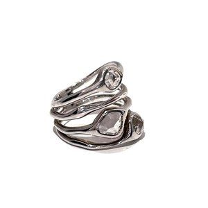 Perfect for date night, this pre-stacked Cluster ring features three irregular-shaped multifaceted Rock Crystal gemstones, set in Sterling Silver. With a width of 19mm, it's a statement piece that adds elegance to any occasion.