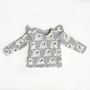 Monica and Andy long sleeve shirt in ghost print and ruffled shoulders, 12 - 18 months