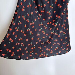 Details: If cherries and wine are good enough for Lana, they’re good enough for us. So pour a glass of red and pour yourself into the Alana black slip dress. Covered in our iconic cherry print, this black version of our best-selling mini style looks badass with thigh high boots or battered Converse. ★ Designed and crafted in London ★ Soft satin made from recycled plastic bottles ★ Hand-drawn cherry print ★ V-neck ★ Self-tie shoulder straps