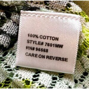 This rare Monique piece features a groovy psychedelic pattern in a saturated green palette, shimmering rhinestone button accent, and a breathable all-cotton knit texture. A true standout for layering or statement wear.