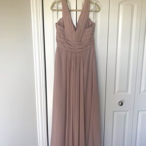 V-neck Chiffon gown with pleated, overlapping bodice. Thick waistband and flowy pleated skirt.