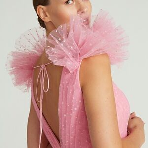 Flourishing with whimsical detail, this fairy-tale mini dress boasts dynamic tulle pleats and voluminous ruffle accents for a best-dressed guest look.