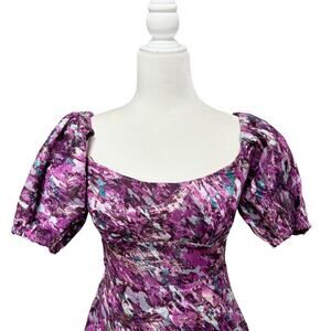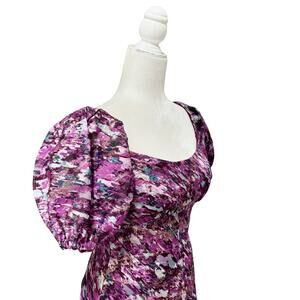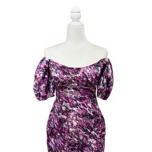 cocktail dress, evening wear, off shoulder dress, metallic finish, wedding guest outfit, purple dress, Monique Lhuillier style, event attire, puff sleeve, formal wear, C3