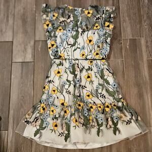 Monique Lhuillier Floral Daisy Embroidered Dress Womens 12 Sheer Overlay Ruffle