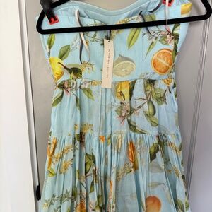 Bright and playful strapless mini dress in a citrus fruit botanical print, crafted from lightweight fabric with a flared skirt. Perfect for summer parties, vacations, or a wedding guest look.