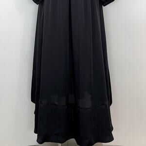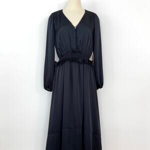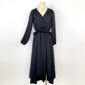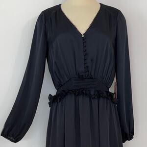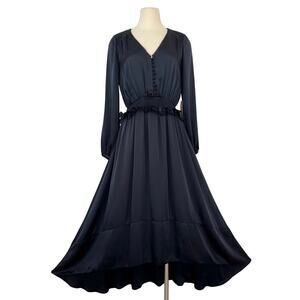 Monique Lhuillier ML Navy Satin Dress High-Low Long Sleeve V-Neck 4 NWT