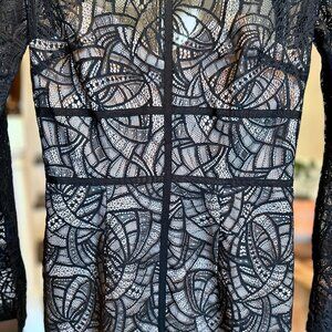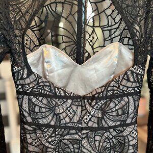Monique Lhuillier Overtones Black Lace Art Deco Cocktail Event Sheath Dress Sz 4