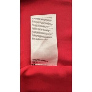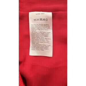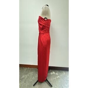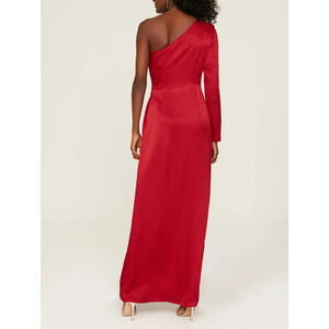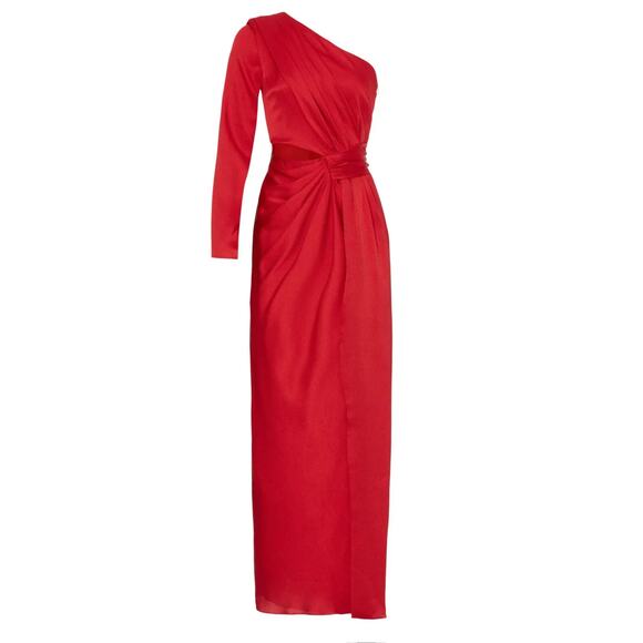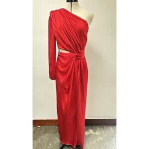Elegant red midi dress. Features one-shoulder design. Draped silhouette. Perfect for special occasions.