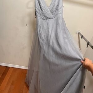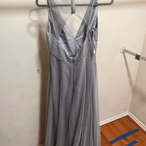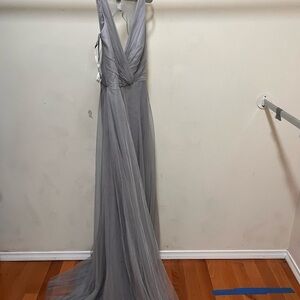 Chic silver maxi dress with a V-neckline. Perfect for elegant occasions.