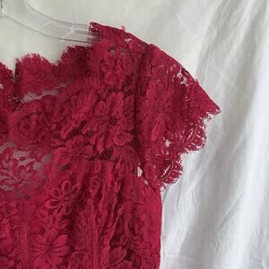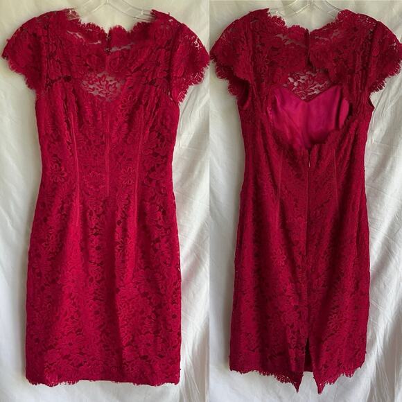 Monique Lhuillier red lace short sheath dress, cap sleeve, Cut Out back, Size 8, glam, party night out, event, holidays, Christmas, special occasion, valentine's.