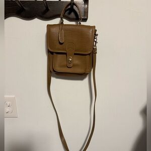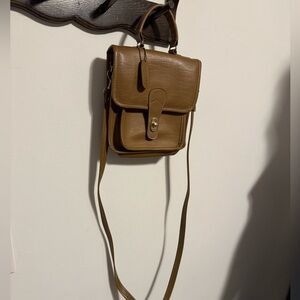 Monique All Weather Wear Tan Vegan Leather Crossbody Satchel Bag. Classic small purse. Pertect size for wallet, cell, keys and makeup. Sustainable brown faux leather material.