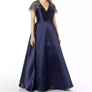 Elegant navy blue gown with lace cap sleeves. V-neckline and full-length skirt. Perfect for formal occasions.