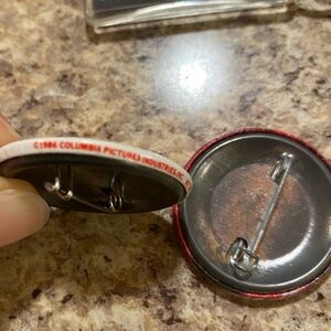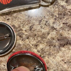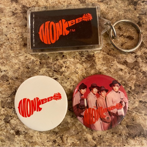 Monkees keychain and button set. Features red and white colors. Perfect collectible for fans.