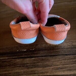 Monkey Feet shoes, 6-12 months, leather. Slip-on, soft suede sole, textured orange upper with heel pull tab, interior is clean, no scuffs on toes, bottoms show some dirt & wear.