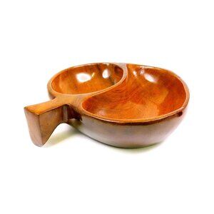 Enhance your space with this beautiful vintage Monkey Pod wood divided leaf bowl, a perfect blend of mid-century modern (MCM) charm and organic craftsmanship. Hand-carved and made in Haiti, this stunning piece showcases the rich tones and smooth grain of Monkey Pod wood, celebrated for its durability and warmth.