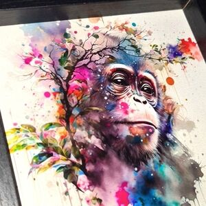 Young Monkey Floral Colorful Rainbow Portrait Watercolor Oil Painting Framed Print Ready to hang!