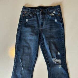 Stylish distressed blue jeans perfect for casual outings. Comfortable fit with a trendy look.