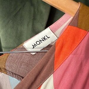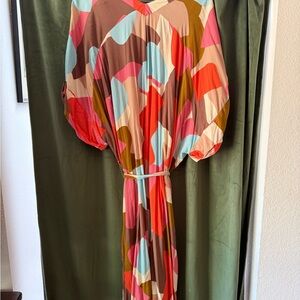 Stylish maxi dress with bold color blocks. Features pink, orange, and brown hues.