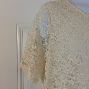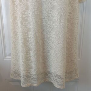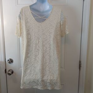 Monki winter white fully lined scoop neck short sleeve lace swing dress with crossover back detail.