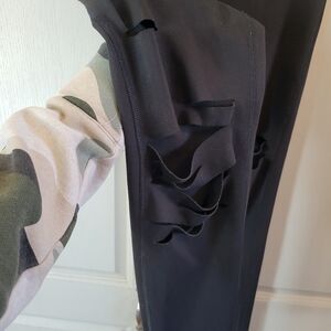 edgy details on the front of leggings with sliced cut distressing