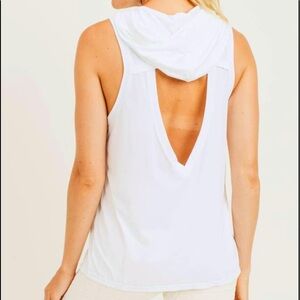 This active tank top is perfect to layer over your favorite Mono B sports bra. It features a hoodie (with drawstring closure) and a reversed triangle cut-out on the back.