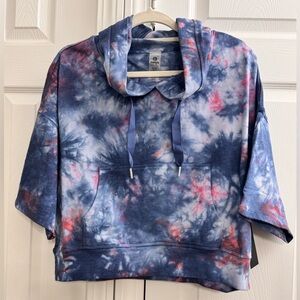Stay cozy in style with this oversized cropped hoodie from Mono B. Featuring a bold blue, red, and white tie-dye pattern, relaxed short sleeves, and a roomy hood with drawstrings, it’s the perfect mix of comfort and trend.