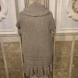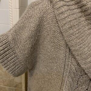 Mono Reno. Sz M. Metallic Full Length Fur Content Open Front Shawl Collar Cardigan. Nylon/acrylic/rabbit fur. Ruffle. Oversized. Has pills but mostly looks like soft finish. Center back 35". Bust 40". No repairs or spots.