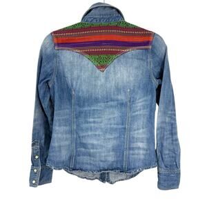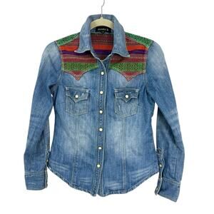 Mono b Southwestern Pearl snap Denim Shirt Colorful woven Accents Wom size small