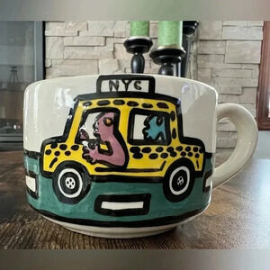 MonoCo | art pottery- handmade NYC taxi cab mug. Colors: yellow, green, black & white. Both sides of the mug have a New York City yellow taxi cab driving on a road hand painted on it. Size: 4” across the top, 5” with the handle, 3” tall. Original piece, NYC art. Like new condition.