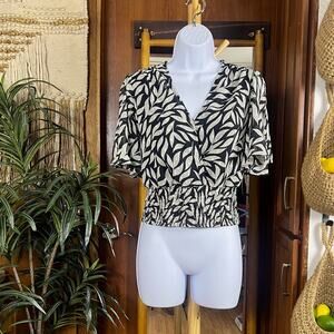 Monochrome Palm Print Flutter Sleeve Blouse S | Black Ivory Resort Editorial Top