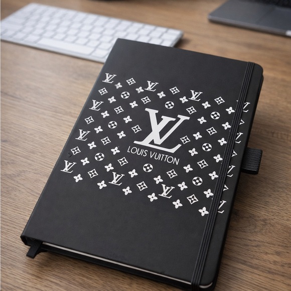 Elegant notebook in black with white logo pattern. Perfect for stylish note-taking.