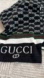 Elegant scarf with iconic monogram pattern. Features bold black and white design. Enhanced with classic green and red stripes.