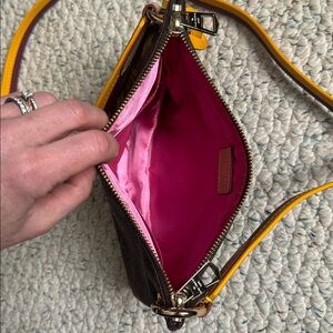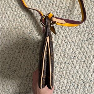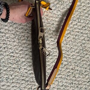 LV monogram crossbody with burgundy & yellow strap. Removable gold rings to change out strap. Features striking yellow accents, double zipper, and yellow luggage tag. Authenticity unknown, but very well made and gorgeous bag.