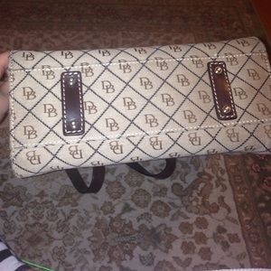 Monogram Dooney & Bourke tote is brown/tan. It was only carried a couple of times. It has a pocket with a zipper in the middle of the bag and has another pocket in the inside of the bag. The bag is spacious and has brown handles. It also has a snap for closure. Ask any questions before buying!