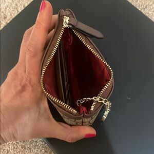 Stylish wallet with keychain. Features brown, green, and red accents.several credit cards internal pockets and an internal ket chain. Sold As Is.