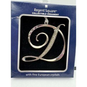 The product is a Monogram Letter D Ornament made of silver and adorned with European crystals. This 2.84" x 3" ornament is perfect for the Christmas season and is part of a collection of holiday decorations. The ornament features elegant lettering and is designed to add a touch of sophistication to any Christmas tree or holiday decor. Made of metal and crystal, this ornament is a beautiful and festive addition to any home during the holiday season.