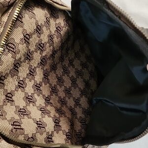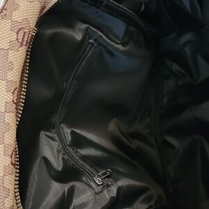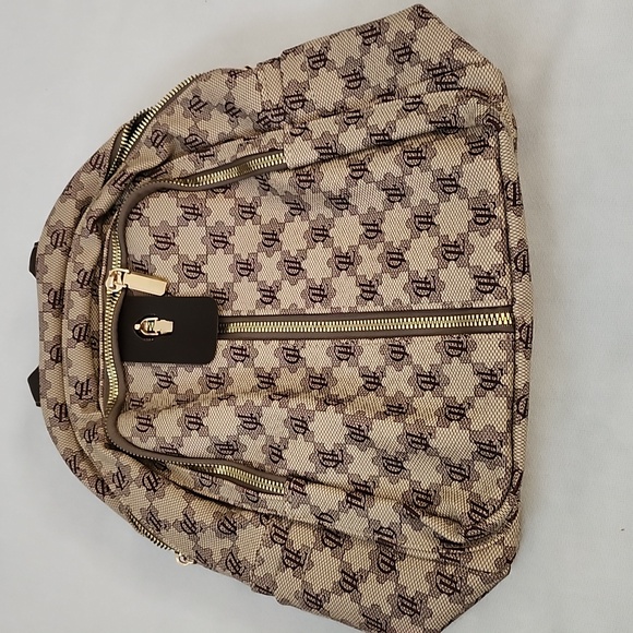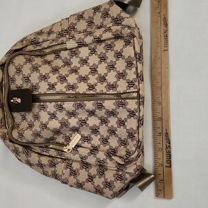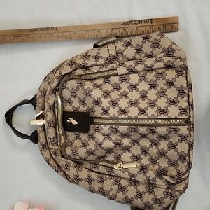 NWOT Brown and Tan Monogram Mini Backpack. Adjustable back straps that are a combination of light tan nylon and brown vegan leather. Brown Leather is also on the back, front tag, and top carrying handle. One main double zippered compartment with two front and one back smaller ones. Roomy interior features wipeable lining, smaller zippered compartment, and two slide pockets. Goldtone hardware all around. Exterior gas slide pockets on either side with, again, that wipeable materials. There are no material tags, but it looks to be a vegan or pu leather. Lovely stylish design but can be used every day. dimensions are in photos, but feel free to ask any questions. sfpf home